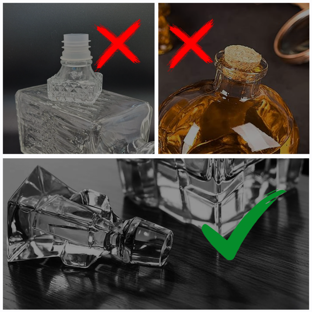 A decanter is only as good as its stopper. If air creeps in, whisky oxidises and gradually loses character. Cork deteriorates, plastic hardens over time, and both compromise a tight seal. The only reliable option is a perfectly matched glass stopper.